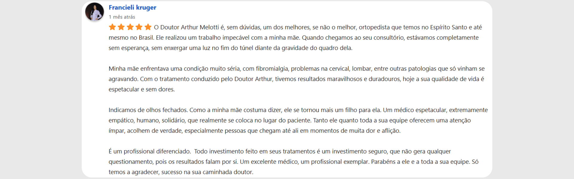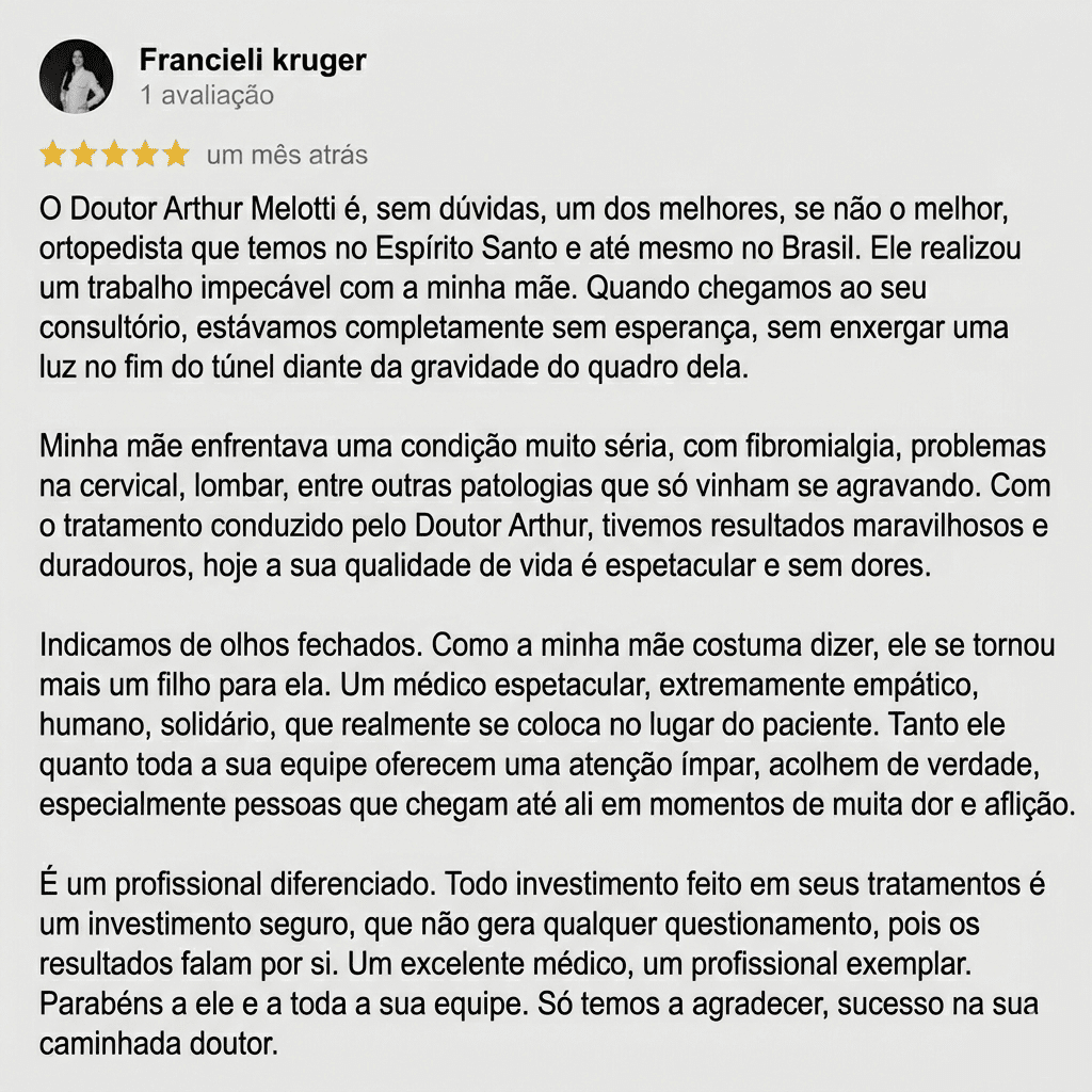 Publicado em Larissa Melotti24/12/2025Trustindex verifica se a fonte original da avaliação é Google. Excelente profissional, atencioso, sempre disposto a entender o paciente.Publicado em Reginaldo carvalho17/12/2025Trustindex verifica se a fonte original da avaliação é Google. Em primeiro lugar quero dizer que eu estava muito mal da coluna, não conseguia fazer nada e hoje me sinto uma pessoa totalmente feliz pelo tratamento e já me sinto curado , estou graças ao bom trabalho que o Dr Arthur está fazendo! Esse é o médico que indico para todos que estão precisando de ajuda para voltar a ser feliz!!Publicado em Dalva Cosme17/12/2025Trustindex verifica se a fonte original da avaliação é Google. Excelente medico , parabéns 😊Publicado em Gildeti Rosseto17/12/2025Trustindex verifica se a fonte original da avaliação é Google. Ótimo profissionalPublicado em Thais Rosseto17/12/2025Trustindex verifica se a fonte original da avaliação é Google. Muito atencioso, excelente profissional.Publicado em gabriela rangel16/12/2025Trustindex verifica se a fonte original da avaliação é Google. Ele um ótimo doutor excelente profissional e com empatia com seus paciente com humanização e respeito vai além do atendimento .Publicado em Giovanna Castro16/12/2025Trustindex verifica se a fonte original da avaliação é Google. Muito atencioso, melhores tratamentos para dor!